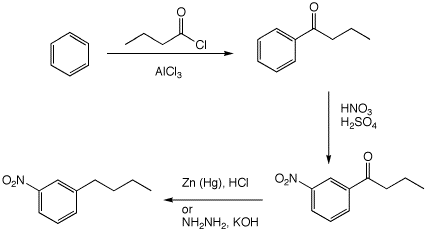 2. (3 points) Show a sequence of reactions that could be used to prepare the compound below, starting from benzene.