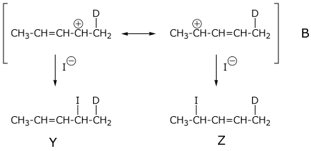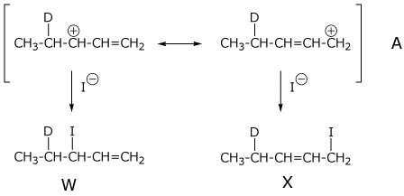 3. (5 points) Addition of DI to the diene below gives two allylic cations (A and B), which give two products each (W, X, Y, and Z).
