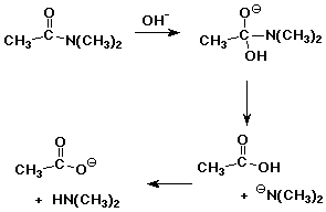 5. (10 points) Write a complete mechanism for the base-catalyzed hydrolysis of N,N-dimethylacetamide. Show all steps and all resonance forms for any intermediates involved.