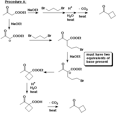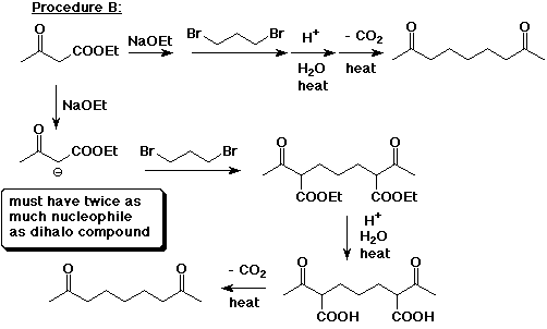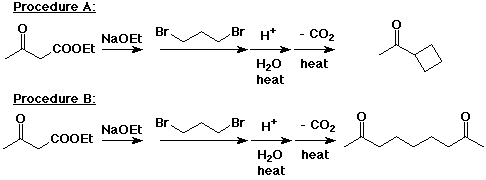 7. (15 points) Depending on the experimental conditions used, an acetoacetic ester synthesis can be used with dihalo compounds to make either a cyclic ketone or an acyclic diketone. Show the steps involved in each of the following two conversions, and describe the differences in experimental conditions that would be necessary to bring about the different results.