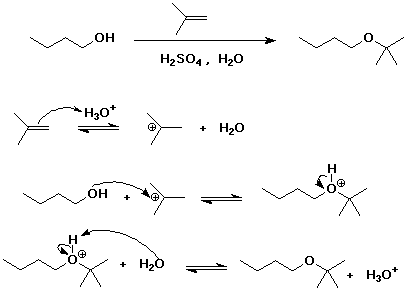 3. (4 points) Write a complete mechanism for the reaction that would be used to create a t-butyl ether as a protecting group for a primary alcohol, as illustrated below. Show all steps and electron-pushing arrows.