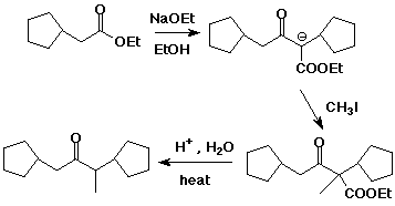 3. (4 pts) It is possible to modify the acetoacetic ester synthesis to make ketones of the general substitution pattern shown below. The synthesis starts by carrying out a Claisen condensation with the ester shown below, and then using that product for the rest of the steps usually performed in an acetoacetic ester synthesis.