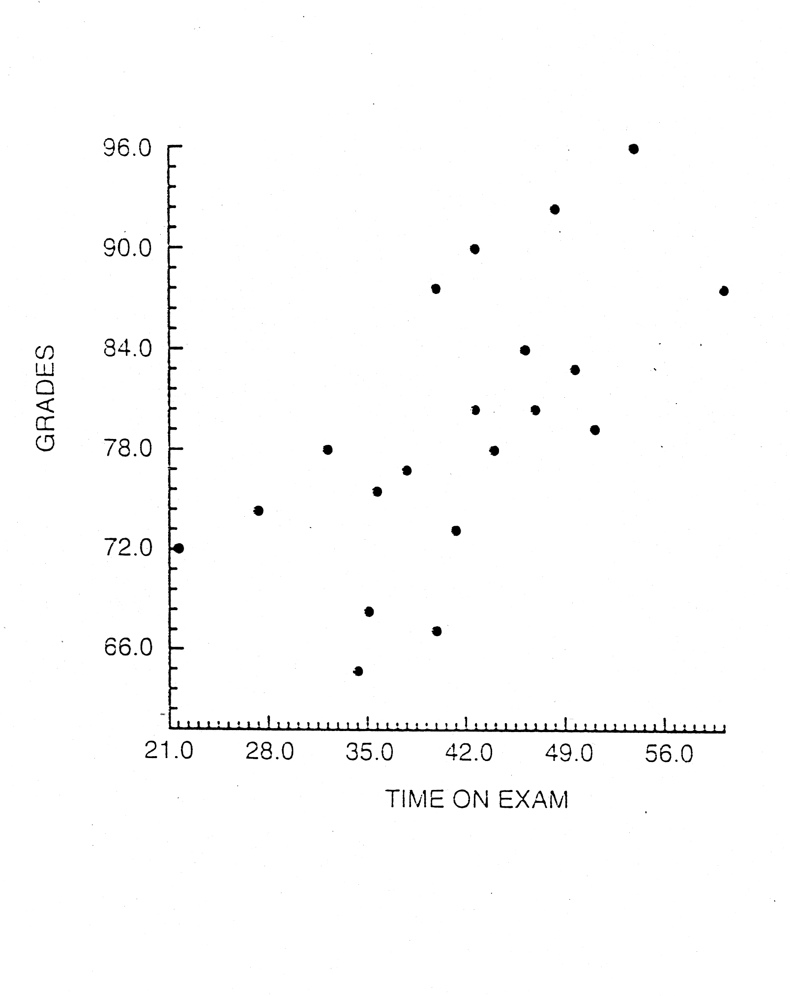certain score for time on the exam, x, and grade, y. The scatter plot reveals