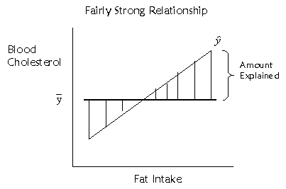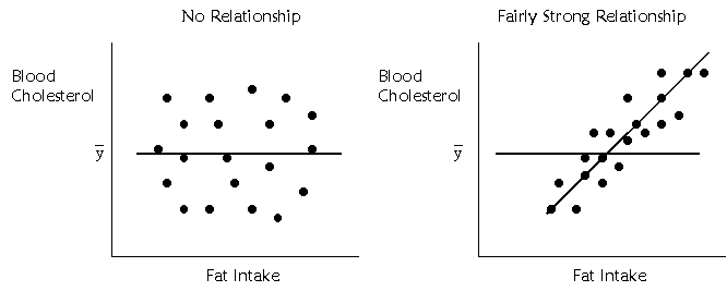 On the left, there is no relationship between fat intake and cholesterol. On the right, there is a relationship. The regression line is flat when there is no ability to predict whatsoever. The regression line is sloped at an angle when there is a relationship.