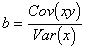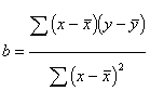 Pretty simple, we've done similar formulas before. Notice that on the top of the formula, we compute the deviations of the x's from the mean of x and the deviation of the y's from the mean and multiple them. We do not square them. This top part of the equation can be called the covariance of x and y. The slope then represents the amount that x and y covary together relative to the overall variation of x. And sometimes the equation for b is written as: