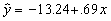 meaning that the y-intercept was a value of -13.24 on the y axis, and the slope of the line is .69. The slope represents the amount of increase in y scores with one unit change in x scores. As we increase the time on the exam by 1 minute (x), we expect scores on the exam (y) to increase by .69. The y-intercept is not always meaningful. For instance, here, it means that when there are 0 minutes spent on the exam, the score on the test is about -13.