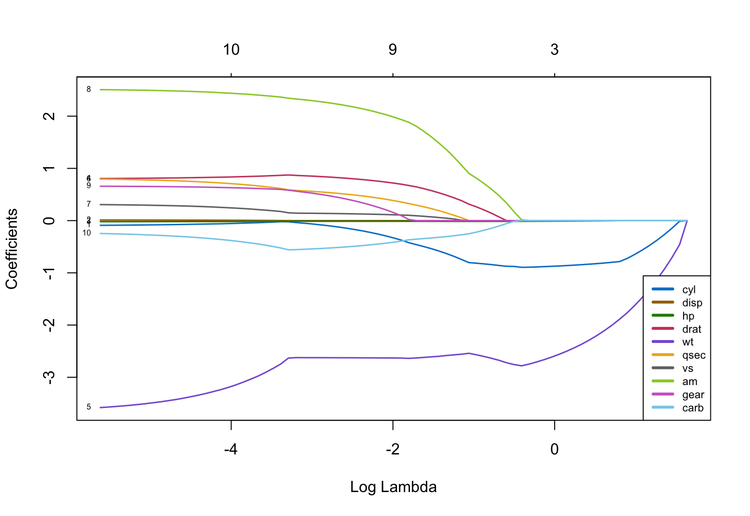 Horsepower, hp, just barely survived the chosen value of \(\lambda\). Its value is very close to 0 in the current solution. For comparison, raise the value of \(\lambda\) until hp effectively drops out of the model.