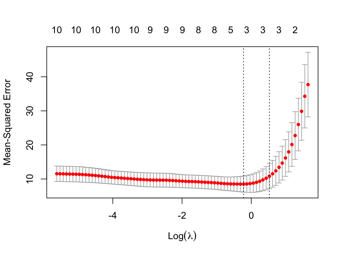 alpha: Set to 1 to specify Lasso regression (0 for Ridge regression and between 0 and 1 for elastic net regression).nfolds: Number of folds, with a default of 10.lambda: The default value of \(\lambda\) is for the function to select its own, but can also explicitly specify trial values of \(\lambda\) to evaluate.