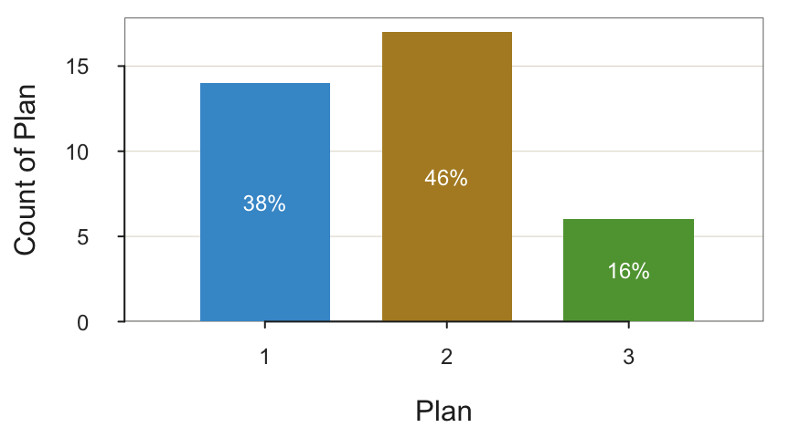The levels of a categorical variable may be coded as integers. For example, for the employee data, the variable Plan is categorical, coded in the data file with the integers 1, 2, and 3 corresponding to three health plans, respectively named GoodHealth, GetWell, and BestCare. The corresponding bar graph necessarily displays these integer values, as illustrated with R/lessR.