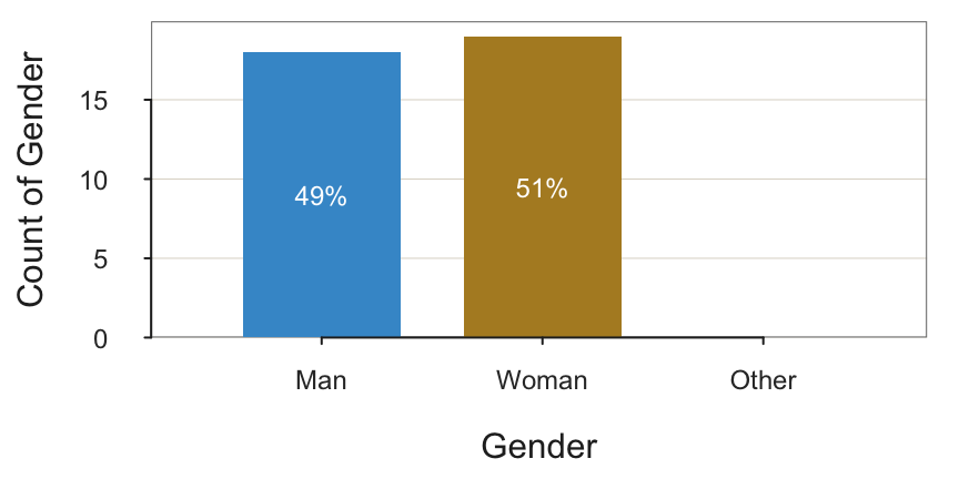 The possible values for Gender are M, W, and O for other. However, in this small data set, there were no responses for O, so the frequency table and corresponding bar chart cannot show a count of a value that does not exist in the data. Fortunately, factor() can include all possible data values, not just those that occurred. Define all possible levels of the categorical variable in their desired presentation order. In this example, also provide the optional labels for greater clarification of each level’s meaning.