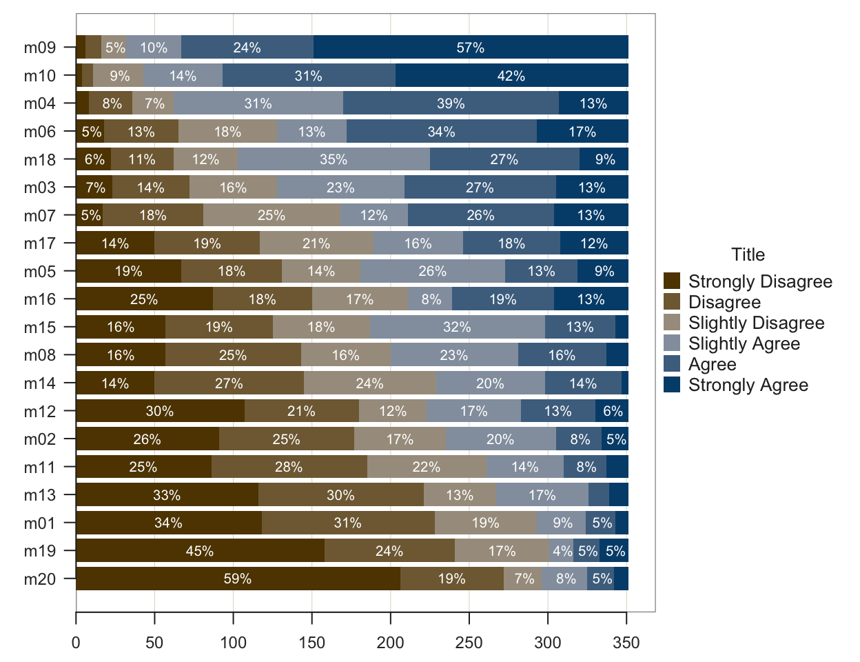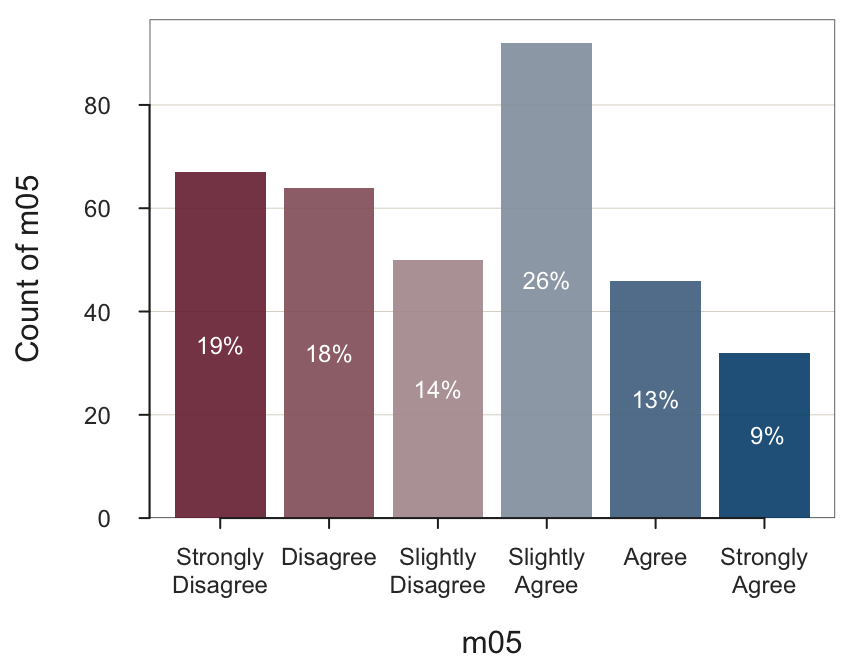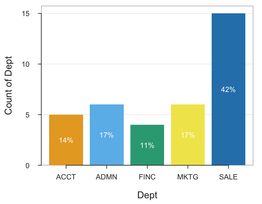 The next example illustrates HEX notation for the fill parameter as part of a call to the BarChart() function. If only one color is specified for the fill parameter in lessR data visualizations, such as the bar chart, then all of the corresponding plotted objects, such as bars, are plotted in that specified color. Figure 8 shows the default blue color obtained within Tableau from its Color parameter setting (mark) and then plots the bars in Tableau`s default blue color.