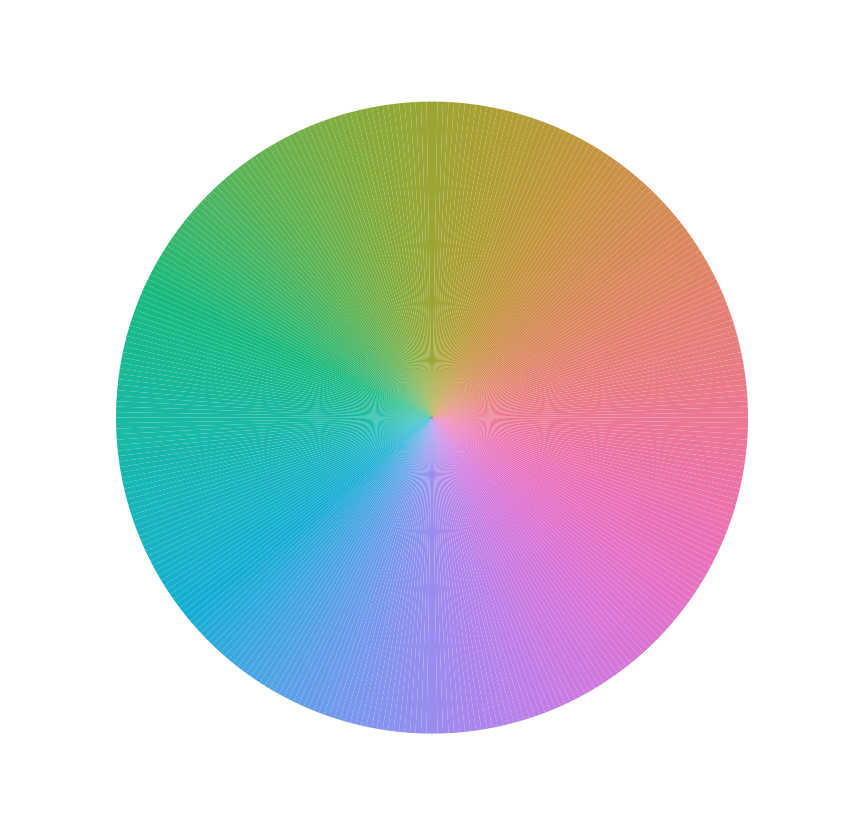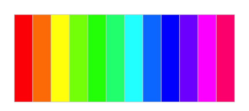Colors are organized according to Sir Isaac Newton’s 1666 creation of the color wheel. The lessR function getColors() generates the version of the color wheel in Figure 1 for mixing light, such as for computer screens. Generate 360 different colors based on the parameter n to approximate the smooth transition between adjacent colors. Set the border parameter to "transparent" to disable the border between colors.