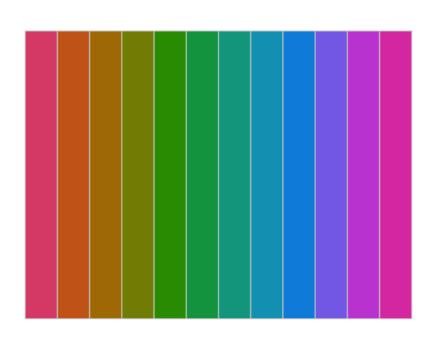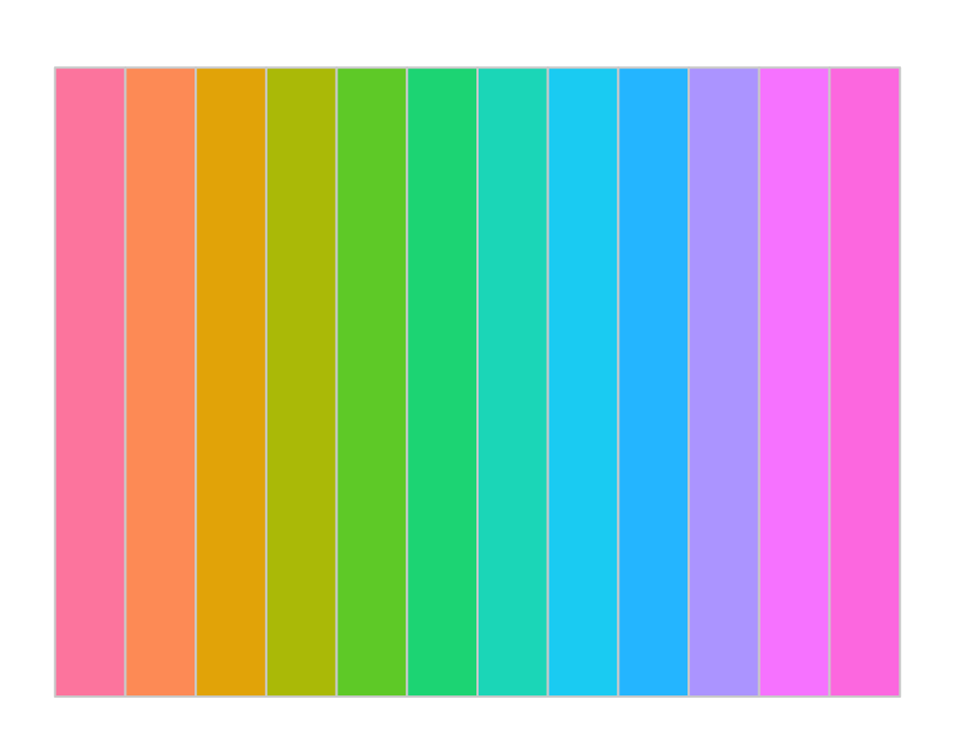 The visualizations in Figure 9 leverage two pre-existing color sequences available from the lessR getColors() function, rainbow from Base R and rainbow_hcl from the colorspace package. Figure 9(a) illustrates the irradiation illusion. The red bar is more vivid than the light green bar. Figure 9(b) demonstrates the visual consistency of HCL colors that vary the hue while maintaining approximately the same chroma and luminance. These HCL colors minimize the irradiation illusion and unintentional focus on part of the visualization to the detriment of the rest.