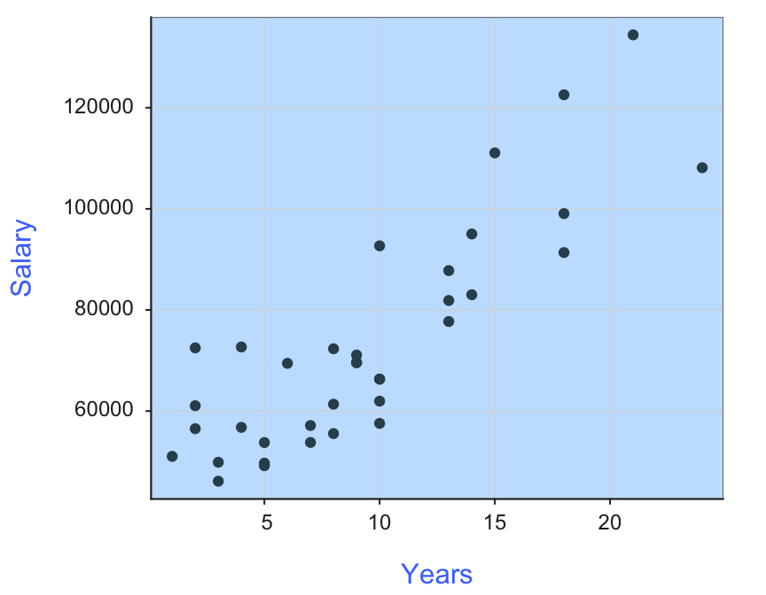 Figure 5 highlights the data values for the administration department in the scatterplot for years employed by the company with salary. Because of the relatively small number of plotted points, the point size was enlarged from the default value of 1.0 to the value of 1.3.
