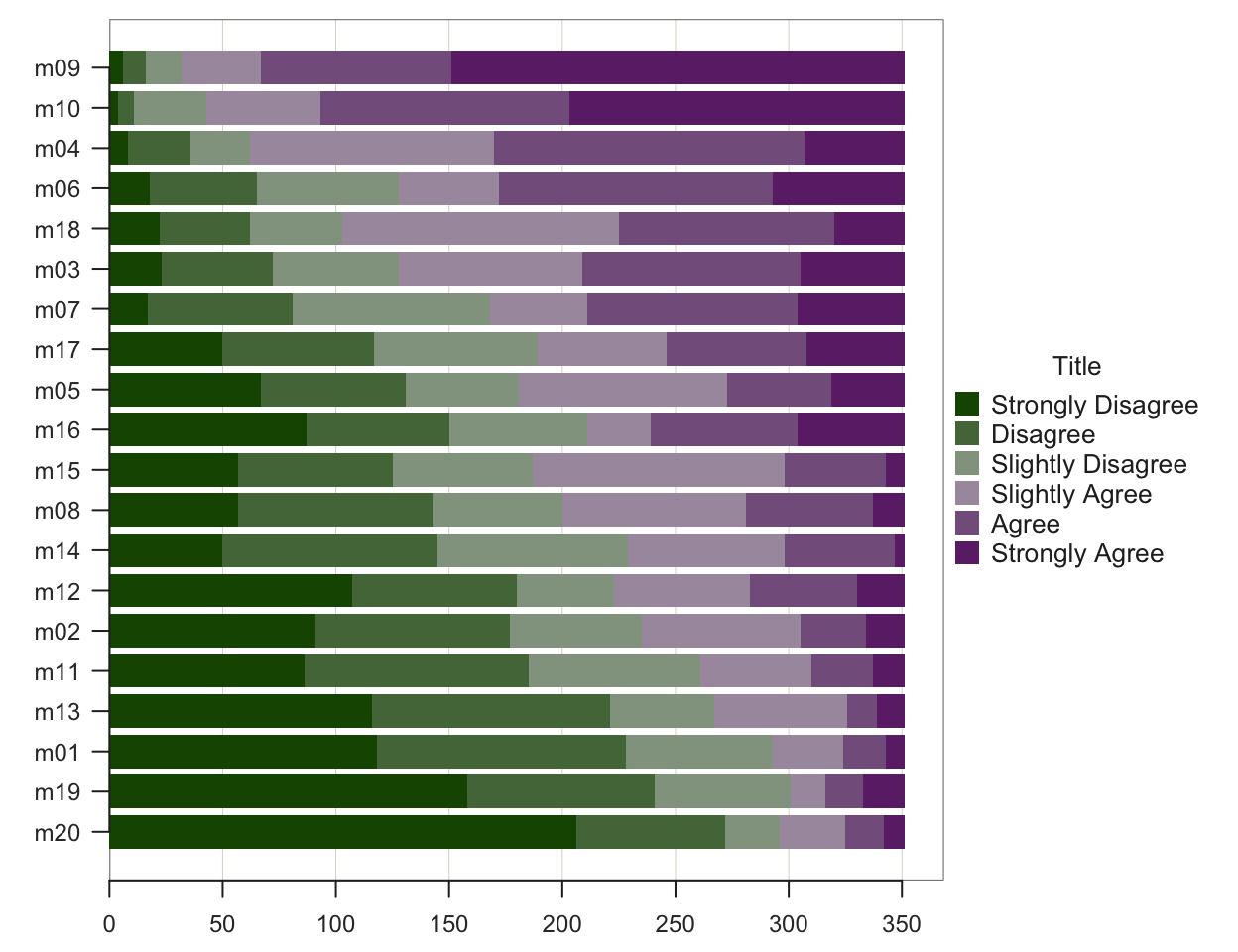 Figure 10 shows three examples of perceptual uniformity achieved with the lessR function getColors() applied to two pre-defined sets of colors. All three examples keep color saturation high, with chroma at 95, but vary luminance from 35 to 75. Obtain vibrant, rich hues from a high value of chroma and a low value of luminance, 35, as in Figure 10 (a). Obtain light, airy pastels from a high value of chroma coupled with a high value of luminance, 75, as in Figure 10 (c).