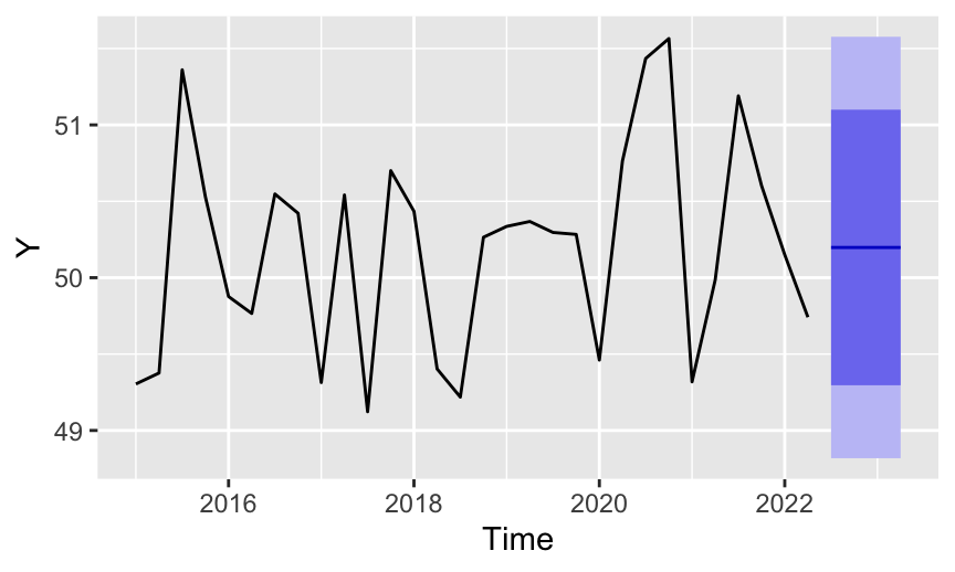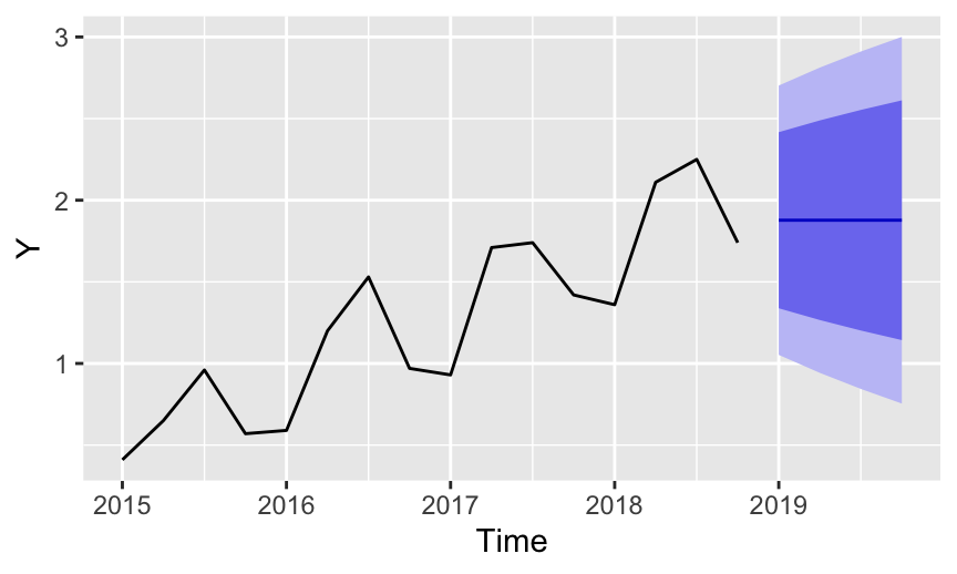 autoplot(f, main=NULL, ylab="Y")List the forecast: