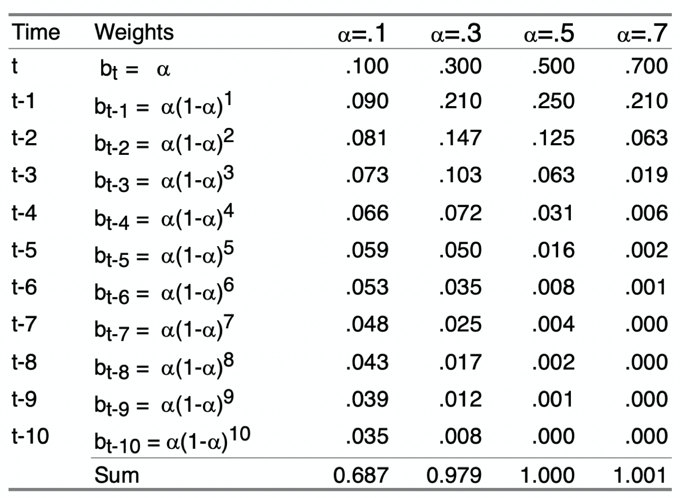 In each of the above expressions for the forecast \(\hat Y_{t+1}\), the forecast is a weighted sum of some past time periods plus the forecast for the last time period considered. This pattern generalizes to all existing previous time periods. The following table in Figure 1 shows the specific values of the weights over the current and 10 previous time periods for four different values of \(\alpha\). More than 10 previous time periods are necessary for the weights for lower values of \(\alpha\), \(\alpha = .1\) and \(\alpha = .3\), to sum to 1.00.