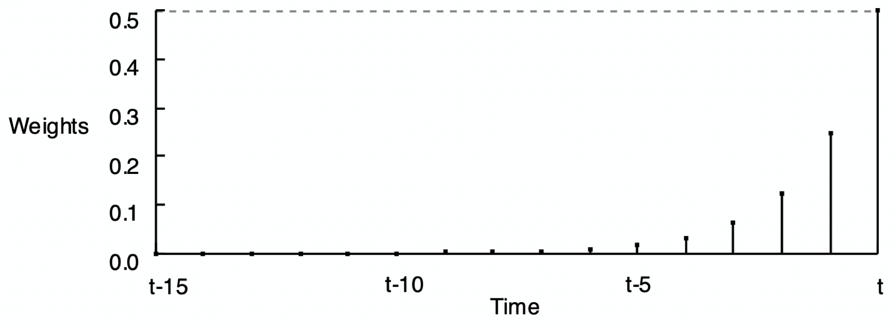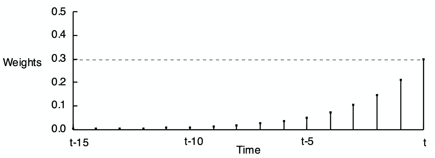 As shown above, an exponential smoothing model expresses the value of Y for the next time period t for a given value of \(\alpha\) only in terms of the current time period. However, a little algebra manipulation shows that implicit in this definition is a set of weights for all previous time values.