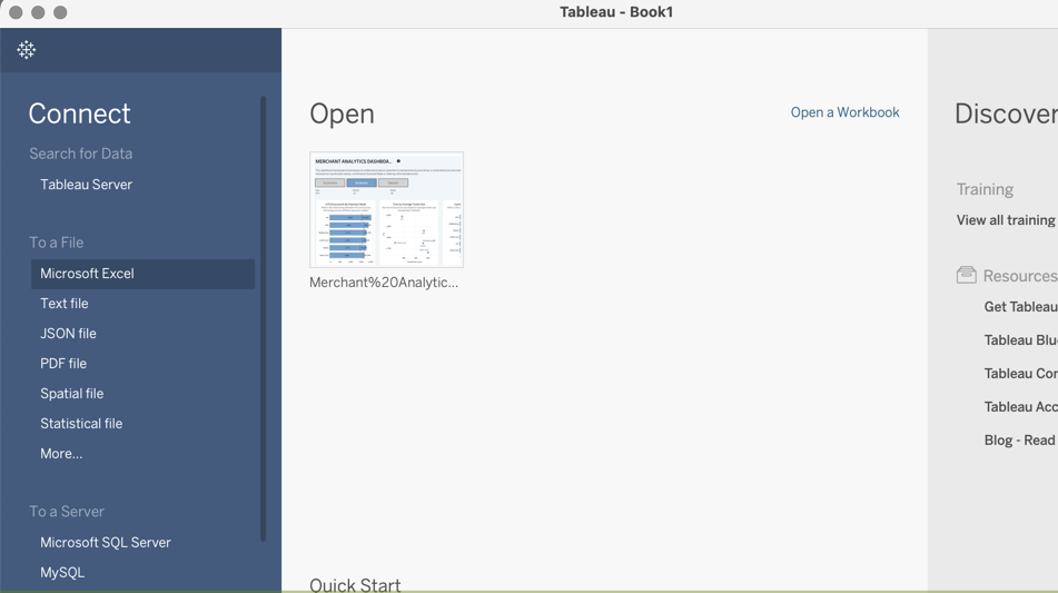 Open the Tableau app. The Connect tab in the left margin invites you to open a data file in a specified format, shown in Figure 1. Here, select an Excel formatted data file.
