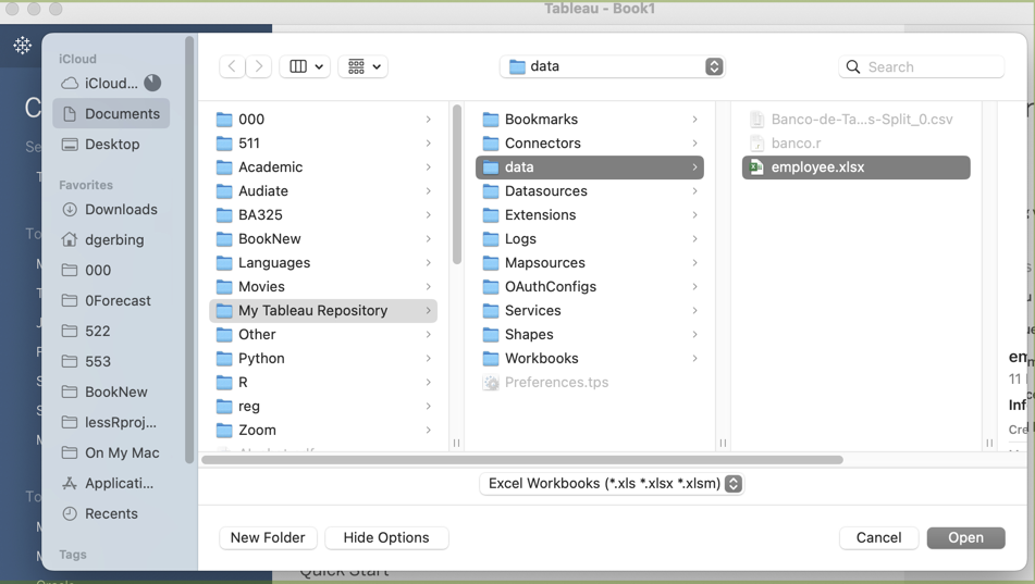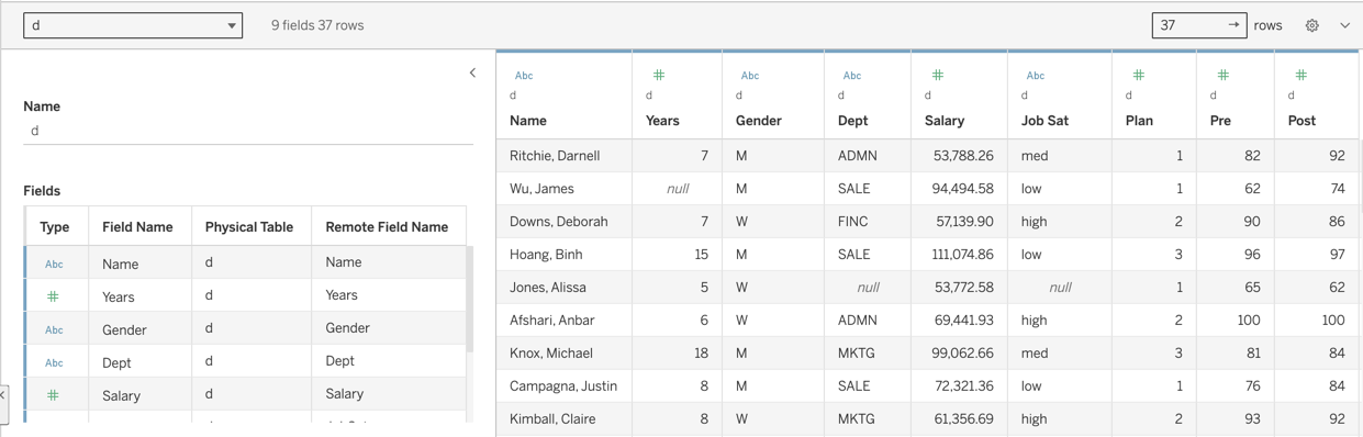 Click on Open to read the data table into Tableau. The Excel worksheet is named d, which is the name of the data table adopted by Tableau.