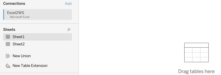 When Tableau accesses an Excel data file with multiple worksheets, the worksheets are listed and you need to select at least one as a data source. To select, drag the worksheet name into the center of the window.