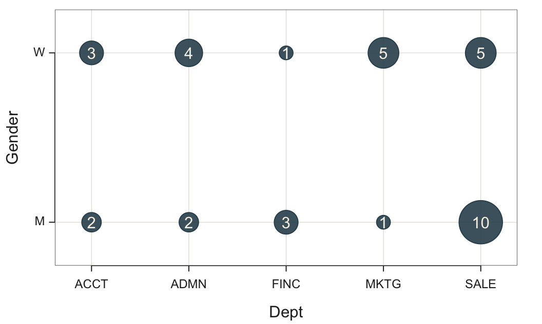 The bubble plot displays a bubble for each group. Figure 9 shows the bubble plot for the count of employees in each combination of department employed and gender.