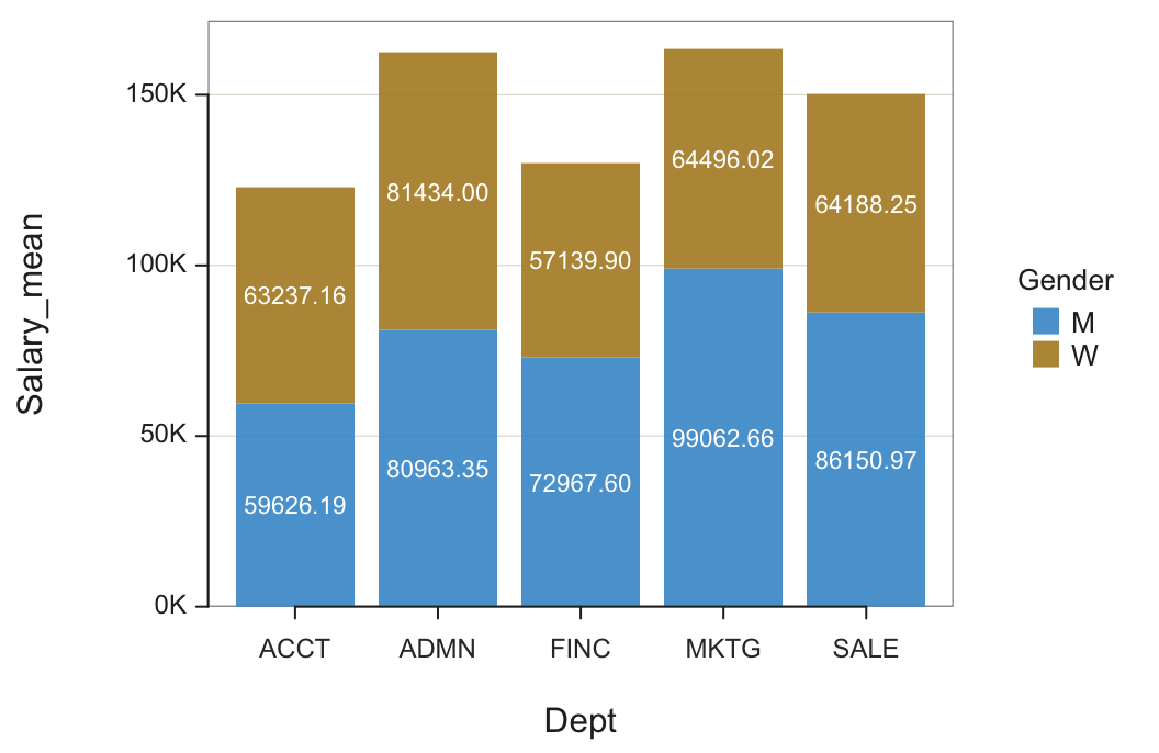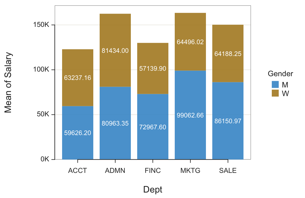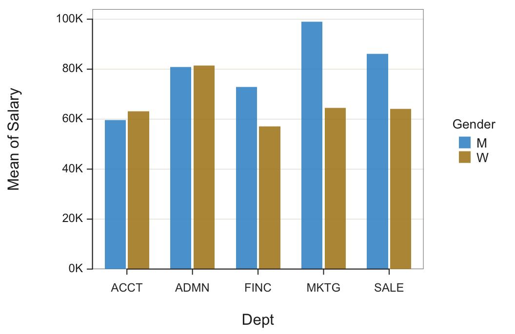 Figure 1 shows a bar chart of mean salary for the employees in each department for men and women constructed entirely from the information in Table 1. Figure 1 is the visual representation of Table 1. All three variables present in the summary table are processed by the bar chart function, in this example: categorical variables Gender and Dept, and continuous variable Salary_mean, the mean for each department.