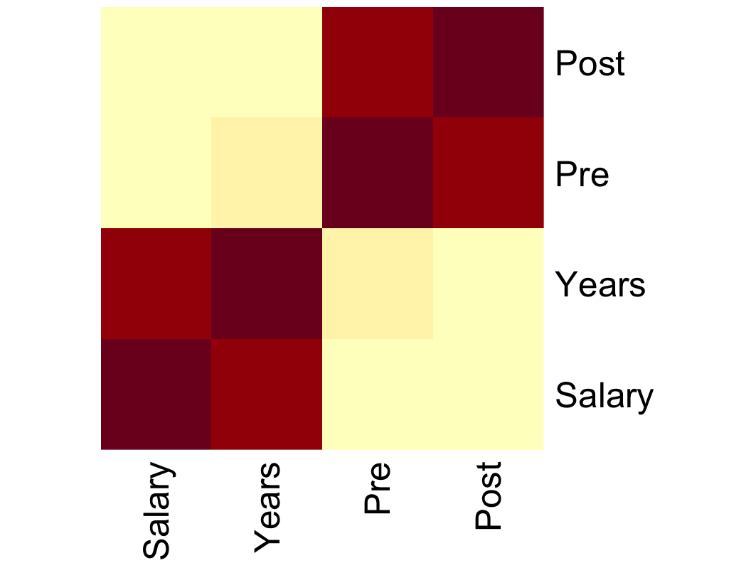 The heat map presents the same information as in the numerical correlation matrix, such as the scatterplot matrix, but with colored squares, the intensity of which indicates the corresponding correlation period. Using the color scheme from Figure 23, the deeper the red color the stronger the correlation. The paler the yellow color, the weaker the correlation. Salary and Years correlate strongly with each other, as do Pre and Post, so these respective correlations are indicated by dark red in the heat map. Other correlations are weak, marked by yellow colors.