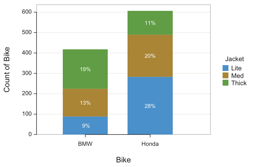 Instead, the interest is the percentage of observations within each level of the first categorical variable, each motorcycle brand. The 100% stacked version of the bar chart facilitates the comparison of the second categorical variable value across the different levels of the first variable by gathering the percentages computed only within a single level.