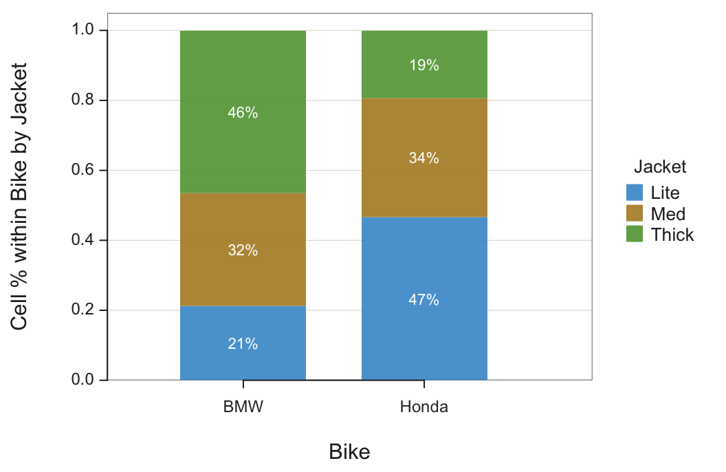 Consider how many Lite jackets to inventory at a BMW rally. The bar chart in Figure 5 shows that 9% of all purchases are made by BMW owners buying a Lite jacket. However, this 9% applies to all the purchases in the entire cross-tabulation table, also impacted by the number jackets purchased by Honda owners.