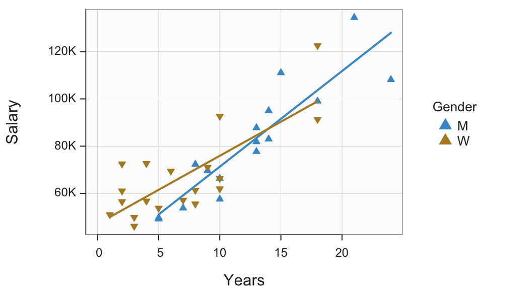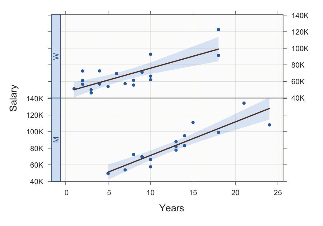 Figure 16 illustrates the Trellis scatterplot of Years and Salary stratified by the categorical variable Gender.