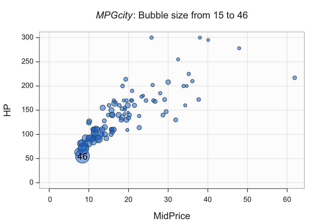 The previous examples in this section mapped a categorical variable as a third variable into one or more visual aesthetics. Another possibility introduces a third variable that is continuous. Figure 17 illustrates a scatterplot of a car’s price with horsepower. Bubbles replace the standard filled small circles. The size of the bubbles indicates the car’s fuel mileage expressed as miles per gallon.
