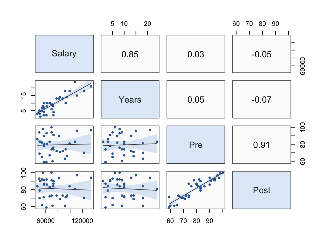 In this 4x4 matrix, Salary and Years correlate strongly with each other, r=0.85. Variables Pre and Post also correlate strongly with each other, r=0.91. The variables in each paired set do not correlate with the variables in the other paired set. For example, Salary only correlates r=.03 with Pre.
