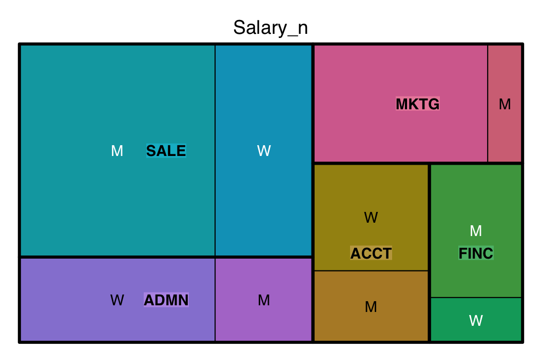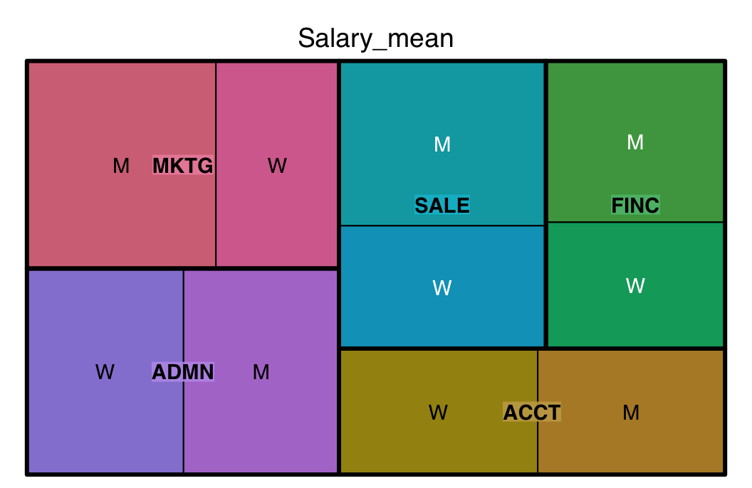 c()function, in this example c(“Dept”, “Gender”). - Third parameter: Numeric variable that sets the size of the rectangles within the treemap, Salary_mean in this example.