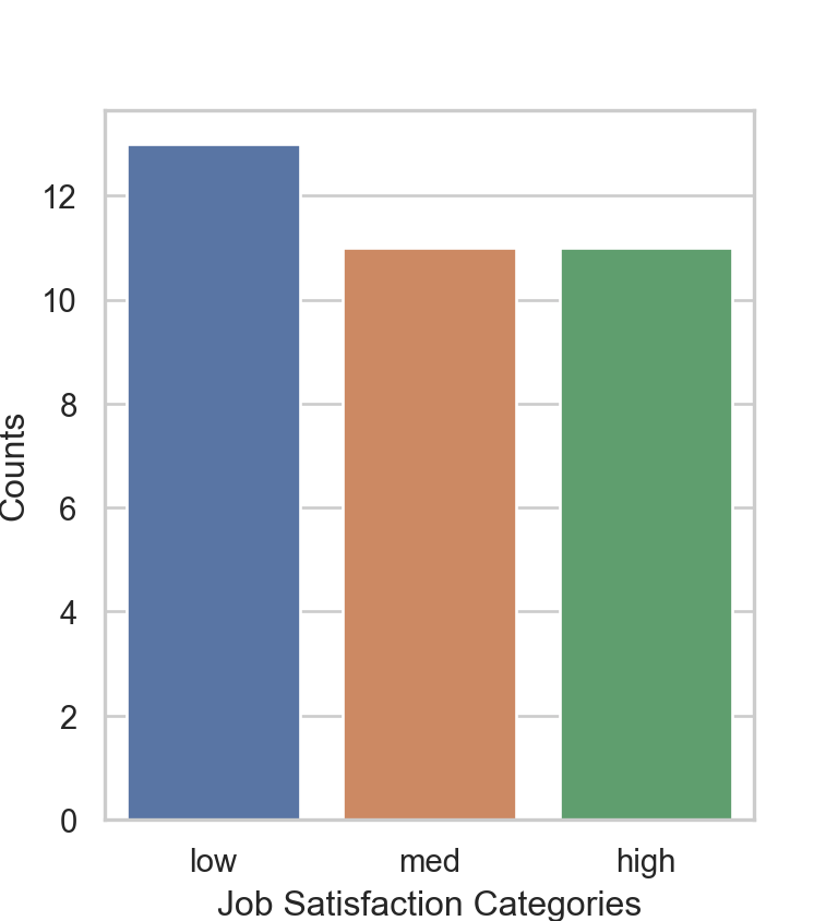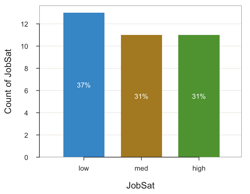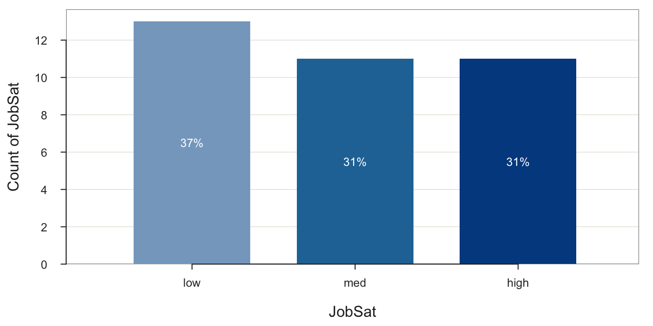 In the Employee data set, three levels describe the categorical variable JobSat: low, med, and high. From this data, construct the bar chart, here from the lessR function BarChart(), but the same principle applies to Python.