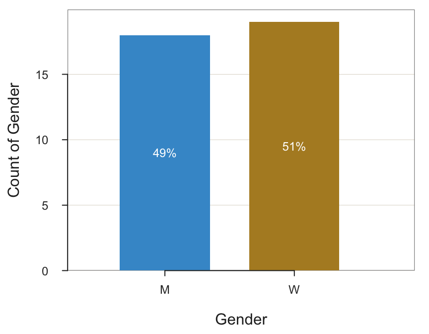 The possible values for Gender are M, W, and O for other. However, in this small data set there were no responses for O, so the frequency table and corresponding bar chart cannot show a count of 0 for this category as it does not exist in the data. Fortunately, factor() allows the inclusion of all possible data values, not just those that occurred, as shown here. Simply define all possible levels of the categorical variable, and here also provide the optional labels for greater clarification of the meaning of each level.