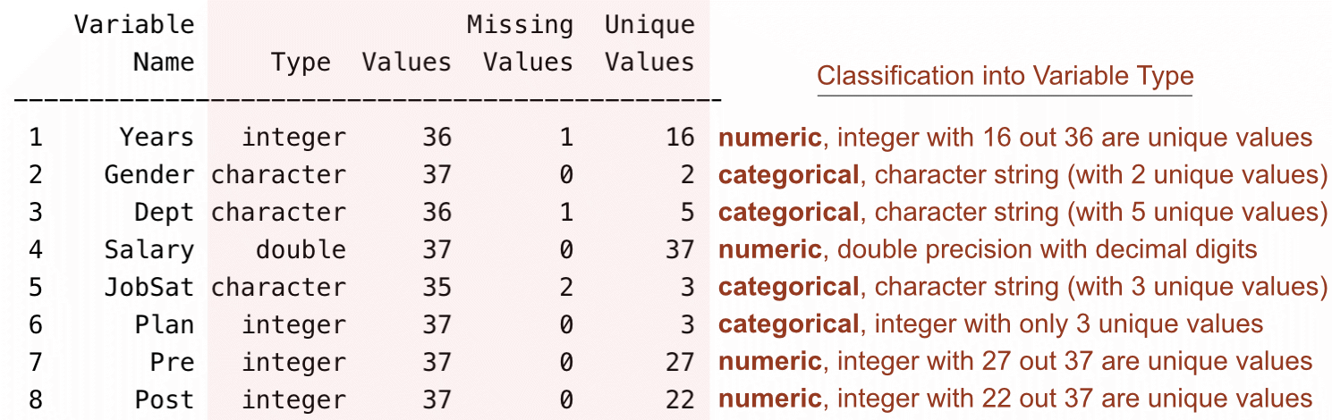 A potential confusion is the lack of a 1-to-1 correspondence between the type of variable, numeric or character, and the data storage type, numeric or character. A categorical variable’s relatively small number of unique, non-numeric values can correspond to any data type. For example, in the data table from the Employee data file, the categorical variable Plan has three integer values – 1, 2, and 3 – that correspond to three health plans. Although the data values are numbers, they only serve as labels and could be replaced with any other set of arbitrary labels such as A, B and C.