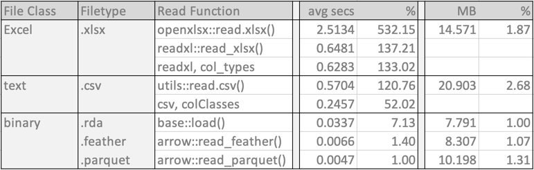 Of the binary formats, by far the fastest read times were achieved for the feather and parquet formats. The native R format required a read time of more than seven times longer than the parquet file. Regarding file format size, the native R data file is the smallest. The feather file format is 7% larger, and the parquet format is 31% larger.