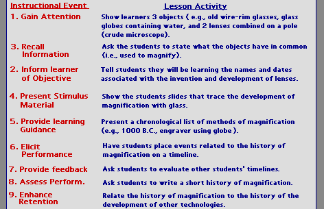 | To design instruction using the Gagne-Briggs model of instructional design, categorize learning outcomes and then organize instructional events for each kind of learning outcome. There are nine instructional events, tailored to the kind of outcome to be achieved that provide prescriptions in the form of activities and interactions. These can be applied in any order. This model has been adapted to web-based instruction. | ![]() |