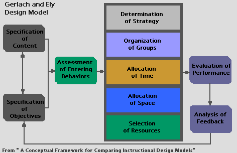 | The Gerlach-Ely Design Model is a prescriptive model that is well suited to higher education. It is meant for novice instructional designers who have knowledge and expertise in a specific context. The model includes strategies for selecting and including media within instruction. It also handles the allocation of resources. | ![]() |