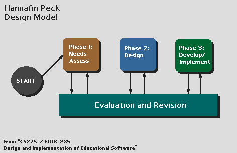 | The Hannafin /Peck Design Model is a three phase process. In the first phase, a needs assessment is performed. This phase is followed by a design phase. In the third phase, instruction is developed and implemented. In this model, all of the phases involve a process of evaluation and revision. | ![]() |