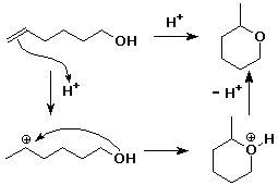 5. (15 points) Acid catalyzes the reaction shown below. Write a stepwise mechanism that illustrates how this reaction occurs, including electron-pushing arrows.