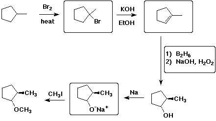 13. (30 points) The following synthetic sequence was used to prepare the final compound shown below. Complete all the empty boxes with the missing compounds or reagents and conditions. (3 pts each)