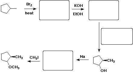 13. (30 points) The following synthetic sequence was used to prepare the final compound shown below. Complete all the empty boxes with the missing compounds or reagents and conditions. (3 pts each)