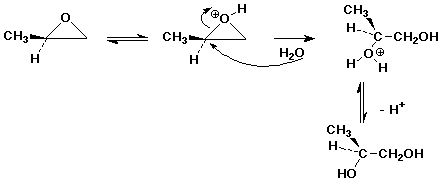 In acid, H2O is a weak nucleophile that attacks the more-substituted carbon because it bears a greater + charge. The chiral center is inverted.
