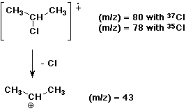 The M and M+2 peaks indicate the presence of Cl. The rest of the molecule appears at 43, which is C3H7, either 1-propyl or 2-propyl.