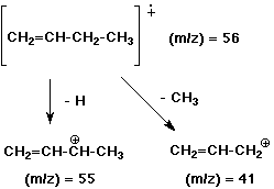 The absence of a significant M+2 peak indicates no Cl or Br. The 41 peak is most likely allyl, a very stable cation. The parent peak is allyl plus a methyl.