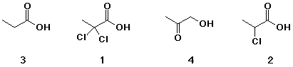 3. (2 points) Arrange the following in order of acidity. Write 1 under the most acidic down to 4 under the least acidic.