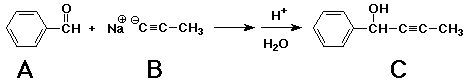 11. (15 points) Compound A ( C7H6O ) reacts with compound B ( C3H3Na ) to form (after aqueous workup) compound C ( C10H10O ).