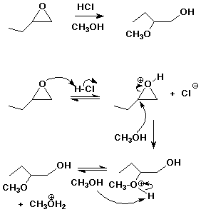 2. (4 pts) Write a complete mechanism for the HCl-catalyzed addition of methanol to 1,2-epoxybutane. Show all steps and electron-pushing arrows.